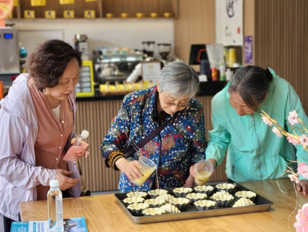 座谈会后老员工们或闲聊或在乐购仕超市参加烘焙体验,临近中午还在笑来喜品尝馄饨、小笼馒头等美食。