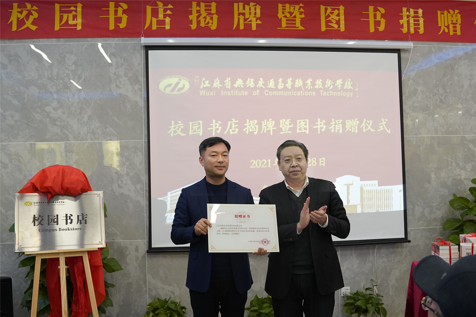 12月28日,学校校园书店揭牌暨图书捐赠仪式在校园书店二楼隆重举行。江苏联合职业技术学院党委书记夏成满,江苏联合职业技术学院教学管理处处长徐伟,学校党委书记、校长李虎,学校党委委员、副校长倪依纯,校园书店建设单位江苏圣晔企业管理咨询有限公司总经理芮郡,参加联合学院无锡地区办学单位党建工作研讨交流会参会领导及嘉宾、学校师生代表近50余人参加会议。会议由学校党委副书记、五级职员朱雨兰主持。