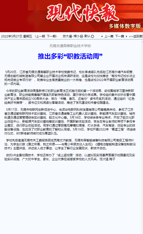 现代快报:推出多彩“职教活动周”,无锡交通高职校学生开展职业体验活动