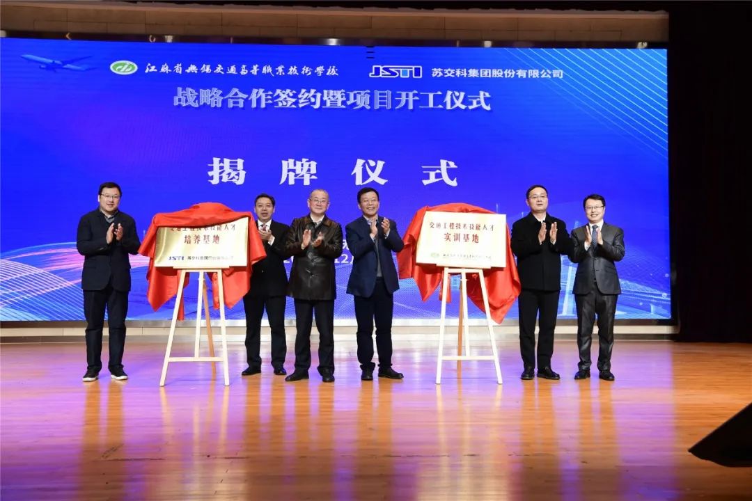 金凌副厅长、夏成满书记、朱晓宁总裁、李虎书记、俞刚局长、惠恭健副局长共同见证战略合作协议的签订,共同为“苏交科集团交通工程技术技能人才培养基地”和“九游官方网页版技术技能人才实训基地”揭牌,并启动生产性交通工程试验检测中心项目开工仪式。