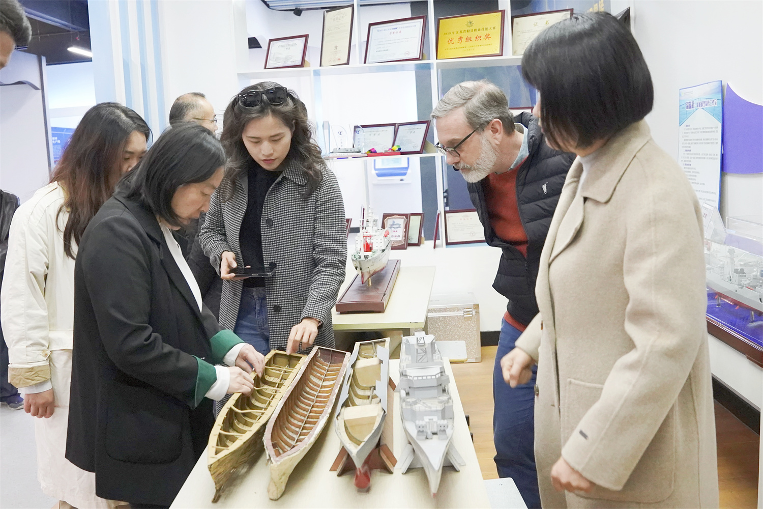 陶校长一行参观了学校船文化中心,了解船模设计与制作等方面的经验与做法,沉浸式学习了学校舟船知识、船舶建造技术、水上安全知识等,表达了合作的美好愿望与协同发展的信心。