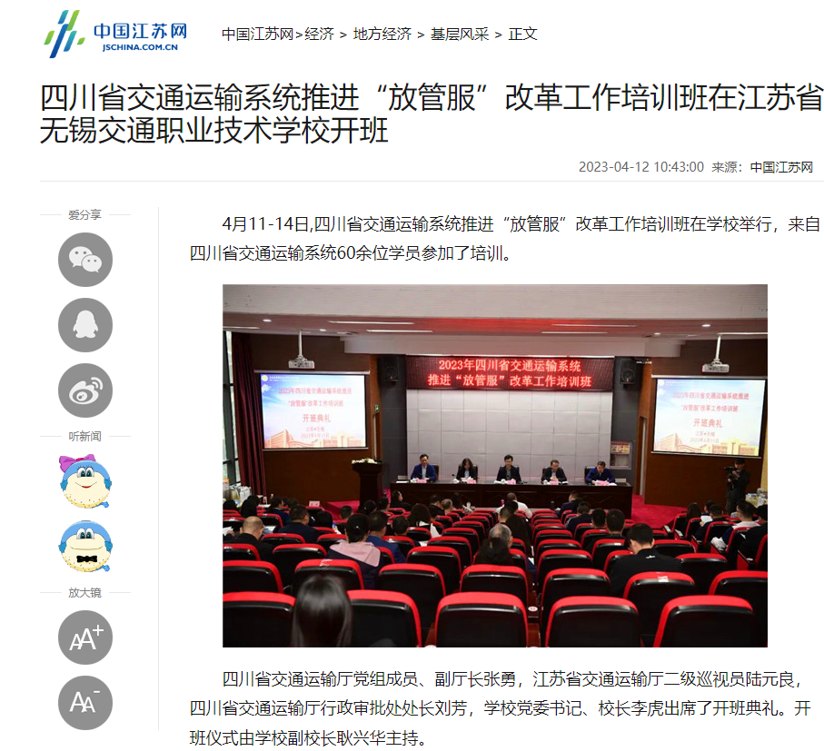 中江网:四川省交通运输系统推进“放管服”改革工作培训班在江苏省无锡交通职业技术学校开班