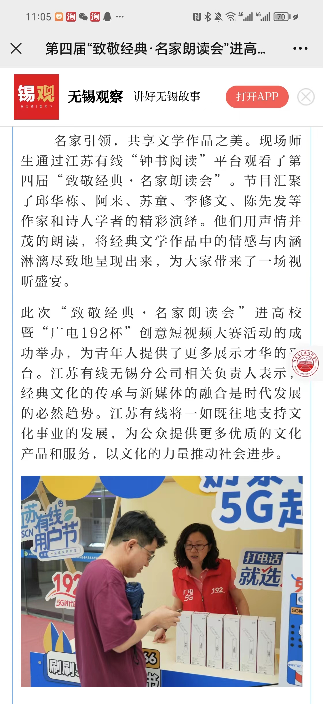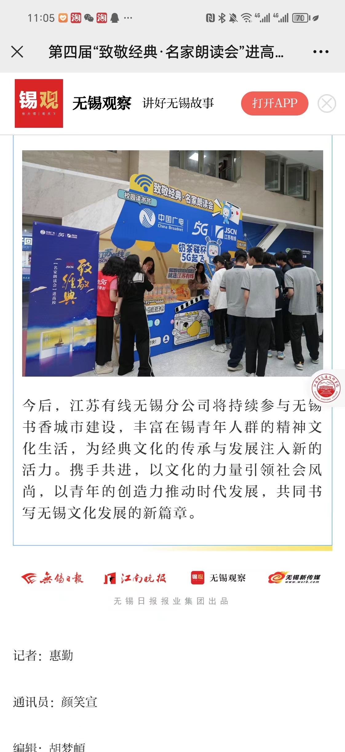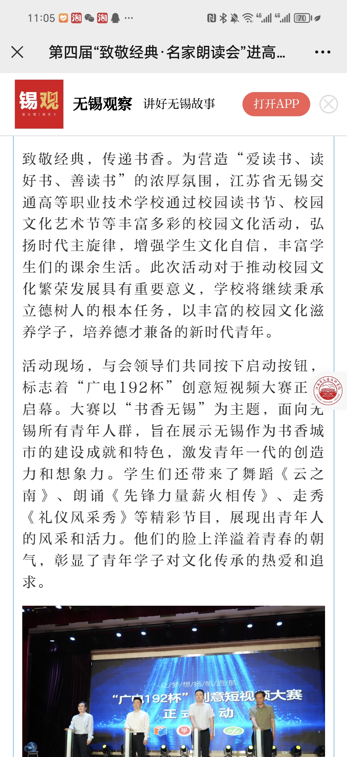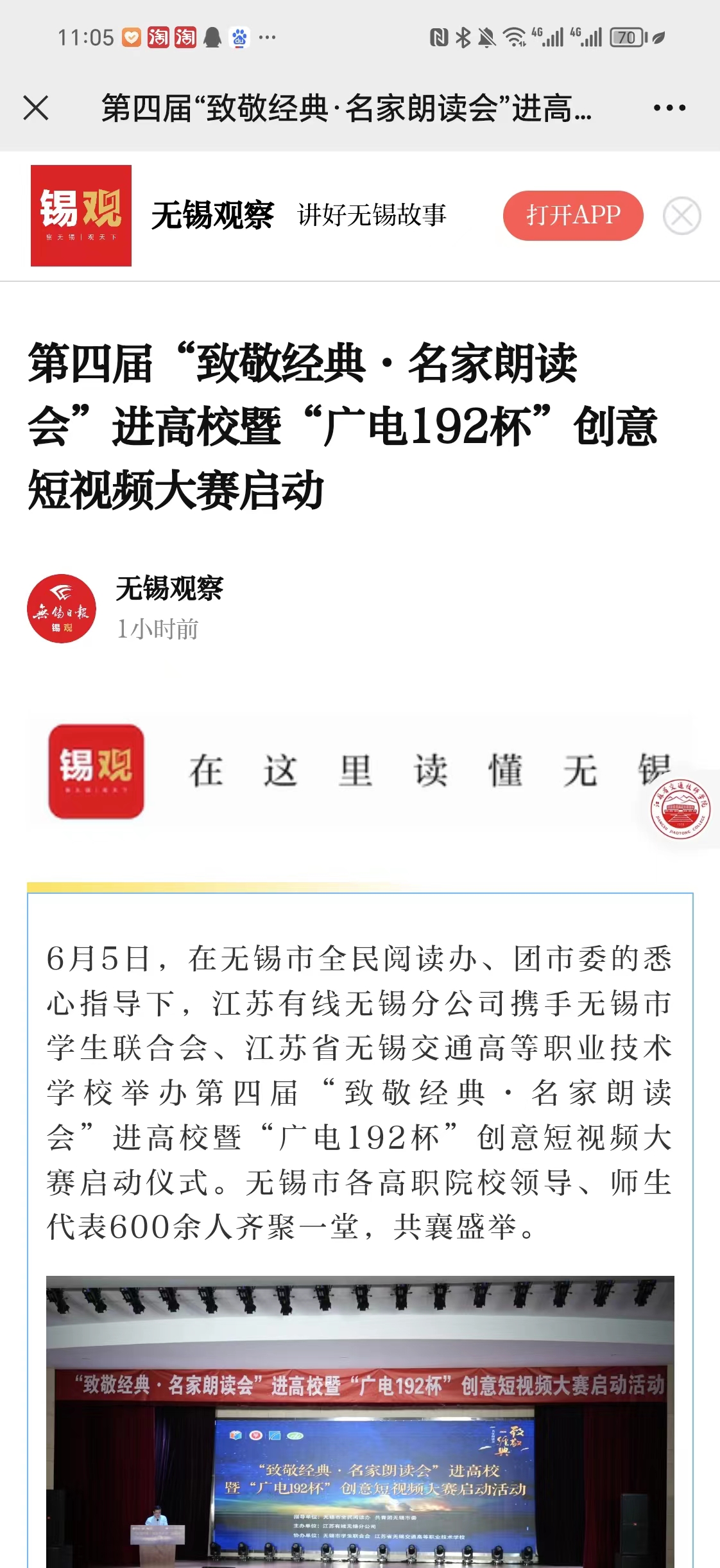 无锡观察:第四届“致敬经典·名家朗读会”进高校暨“广电192杯”创意短视频大赛启动