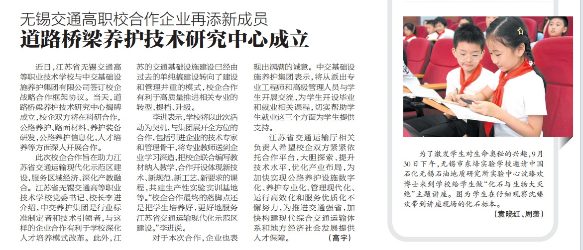无锡日报:无锡交通高职校合作企业再添新成员 道路桥梁养护技术研究中心成立