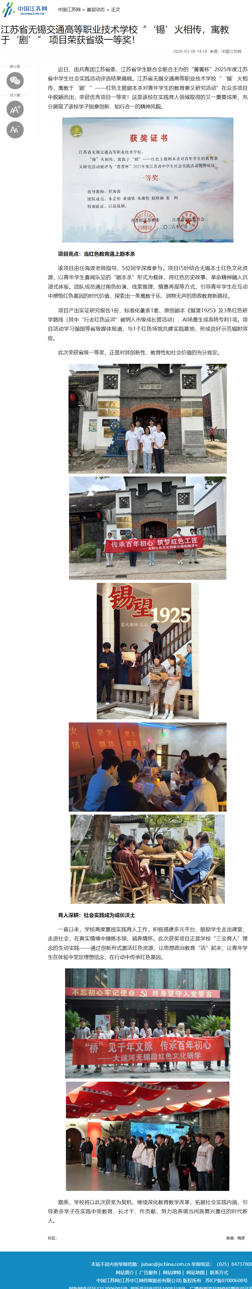 中江网:九游官方网页版“‘锡’火相传,寓教于‘剧’” 项目荣获省级一等奖!