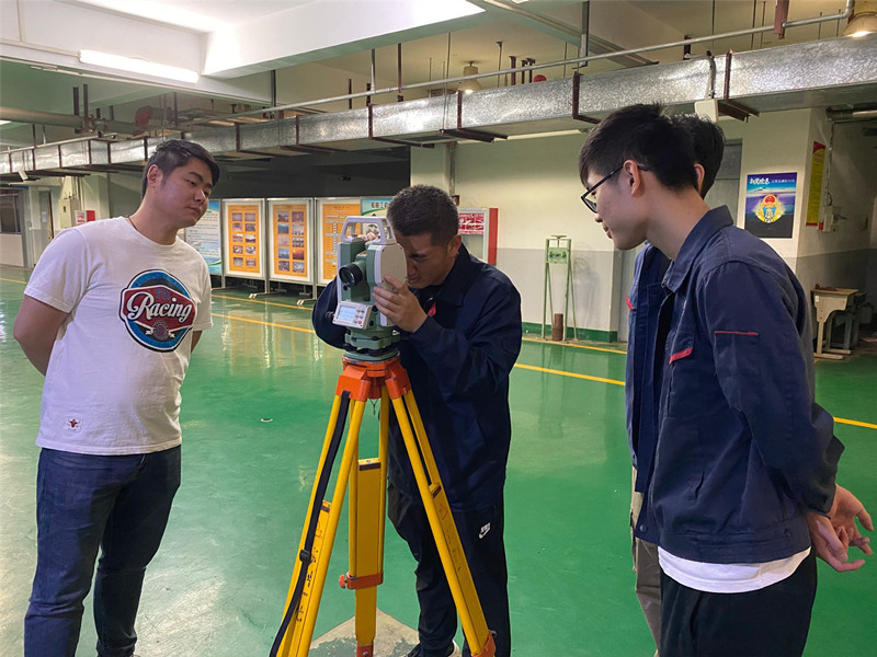 本次比赛共有来自船舶工程学院轮机工程技术专业17114111名同学参加。比赛要求学生利用激光电子经纬仪(LT 402L)及其三角支架、标尺、卷尺、水平尺和扳手等工量具根据轴系布置图和赛场给定的标记点,确定尾基点的位置,再操作使用激光经纬仪建立轴系理论中心线,调整尾轴管位置,最终使尾轴管中心与轴系理论中心线同轴。