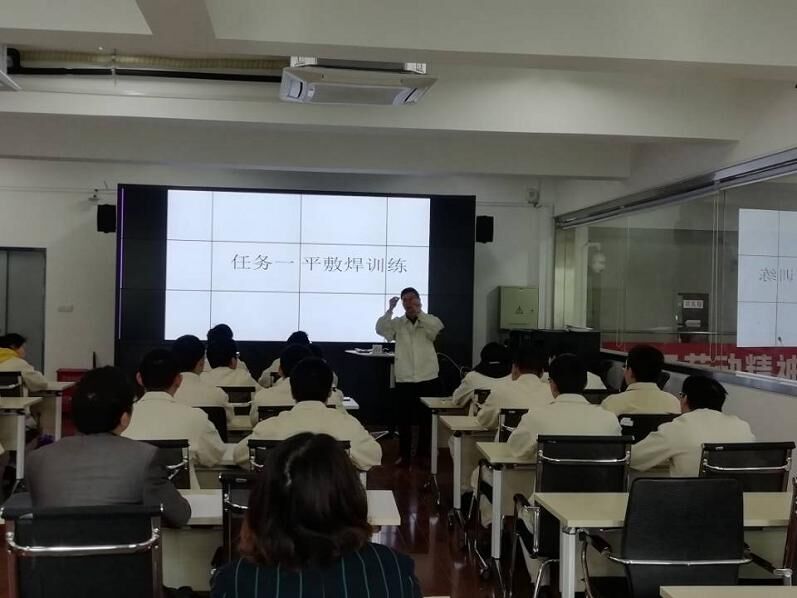 课上,张宏伟老师首先简要回顾了焊接引弧的方法及操作要领,然后导入本次课的任务—平敷焊,并明确的给出了训练的目标、具体要求及重难点,接着详细的介绍了平敷焊的相关工艺知识、操作准备、操作要领,最后对班级进行分组,在焊接车间给学生进行演示,待学生熟悉操作要领后,学生开始领取工件和相关设备进行训练。课后,听课老师也进行了畅所欲言的交流,大家一致认为课堂理实一体,授课目标、要求明确、重难点突出,有理论讲解又有操作示范,课堂形象生动,学生们劳保用品穿戴整齐、注重车间安全等优点;也指出了不足之处,如授课应配备翻页器、配备小黑板对课堂主要相关内容进行板书、任务式教学可以印刷任务书发给学生、授课评价体系采用多元化评价方式等,各位评课教师都真诚的提出了自己的建议和想法。