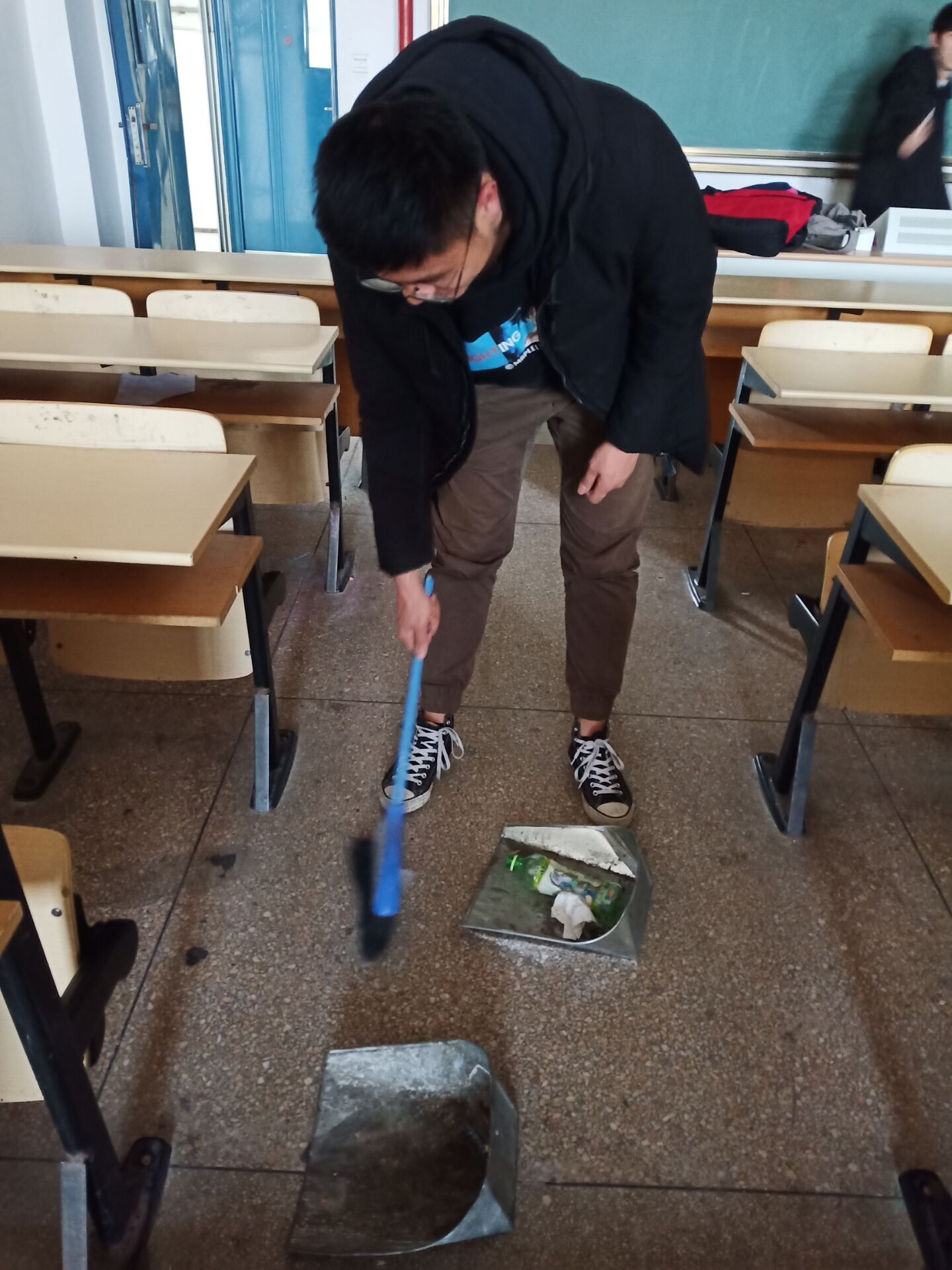 在三月份学雷锋活动月里的一个下午,班级组织一部分同学去楼上阶梯教室打扫卫生,有的教室脏的不成样子,有的教室却很干净,同学们打扫卫生却都是认真对待,一丝不苟。