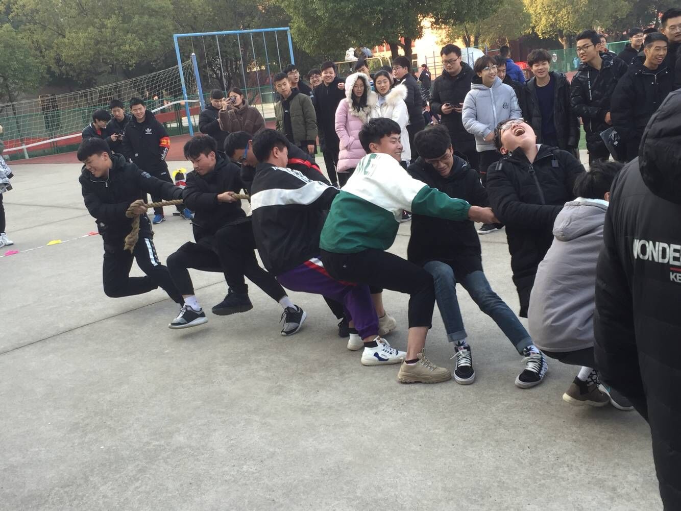 比赛在裁判的一声哨声后开始了,只见参赛的队员们紧握长绳,卯足了劲拼命往后拉!学校老师也在队伍旁边助阵!未参赛的学生自发组成拉拉队为比赛队员呐喊加油、呐喊声此起彼伏,现场激烈的比赛将整个活动推到了高潮!虽然比赛的人与观众很多,但是在体育部与文娱部的合作下顺利进行着。