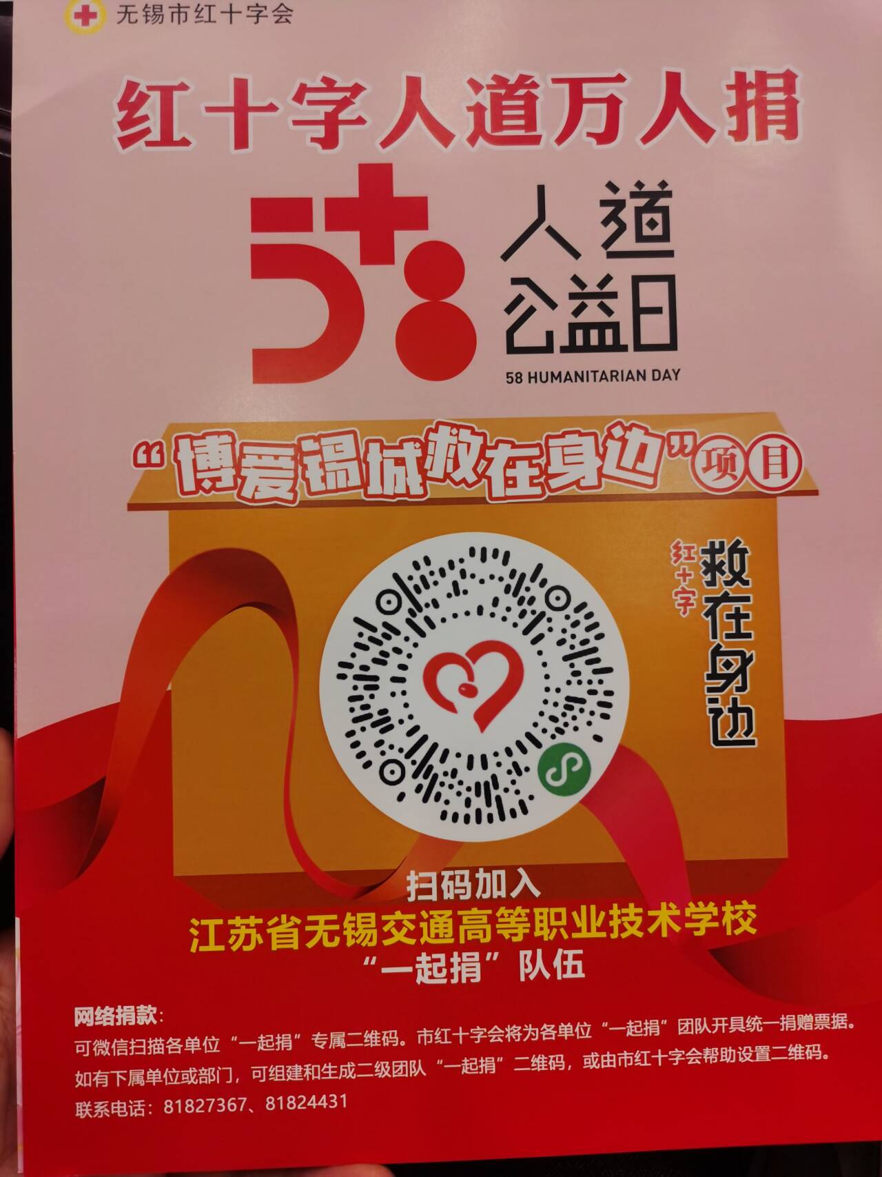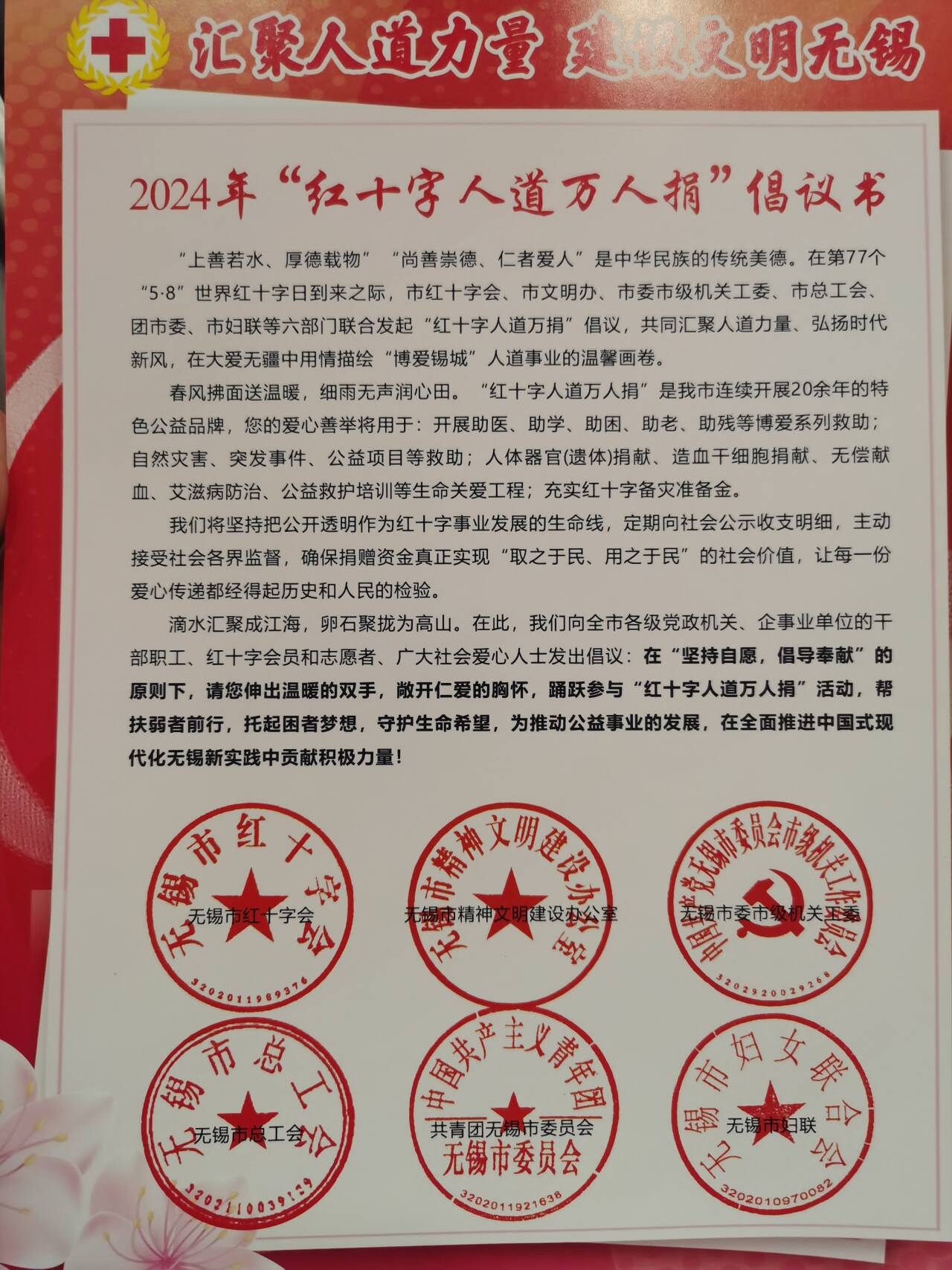 为响应市红十字会、市文明办、市委市级机关工委、市总工会、共青团市委、市妇联等上级单位发起的纪念5月8日世界红十字日《2024年红十字会人道万人捐倡议书》,共同汇聚人道力量,弘扬时代新风,我校拟组织教职工积极参与。
