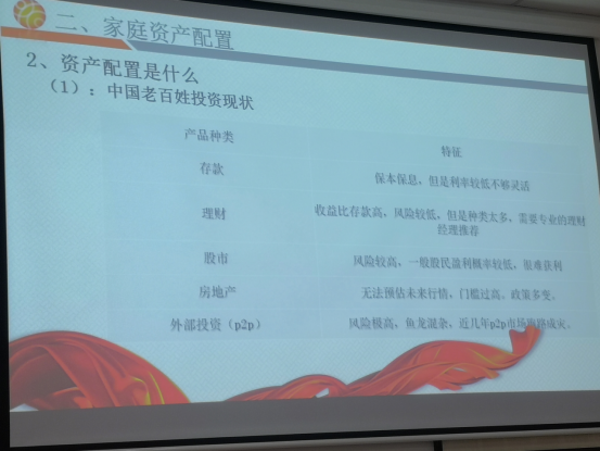 随着人们生活水平的不断提高,对闲置资产的管理需求越来越旺盛,如何让自己的财富稳步增值,让手里的闲钱不贬值?2019年4月25日学校邀请宁波银行营业部个人银行部在职工之家举行了“金融下午茶” 理财讲座。个人银行部李副总经理从《小积累大财富,拿什么抱住你的钱袋子》、《8090暴富经》、《聊聊税改》、《工资这么打理就对了》等几个话题和大家一起进行讨论,通过一个半小时的讲解,老师们学到了金融理财的知识,提高了老师们的投资理财能力。