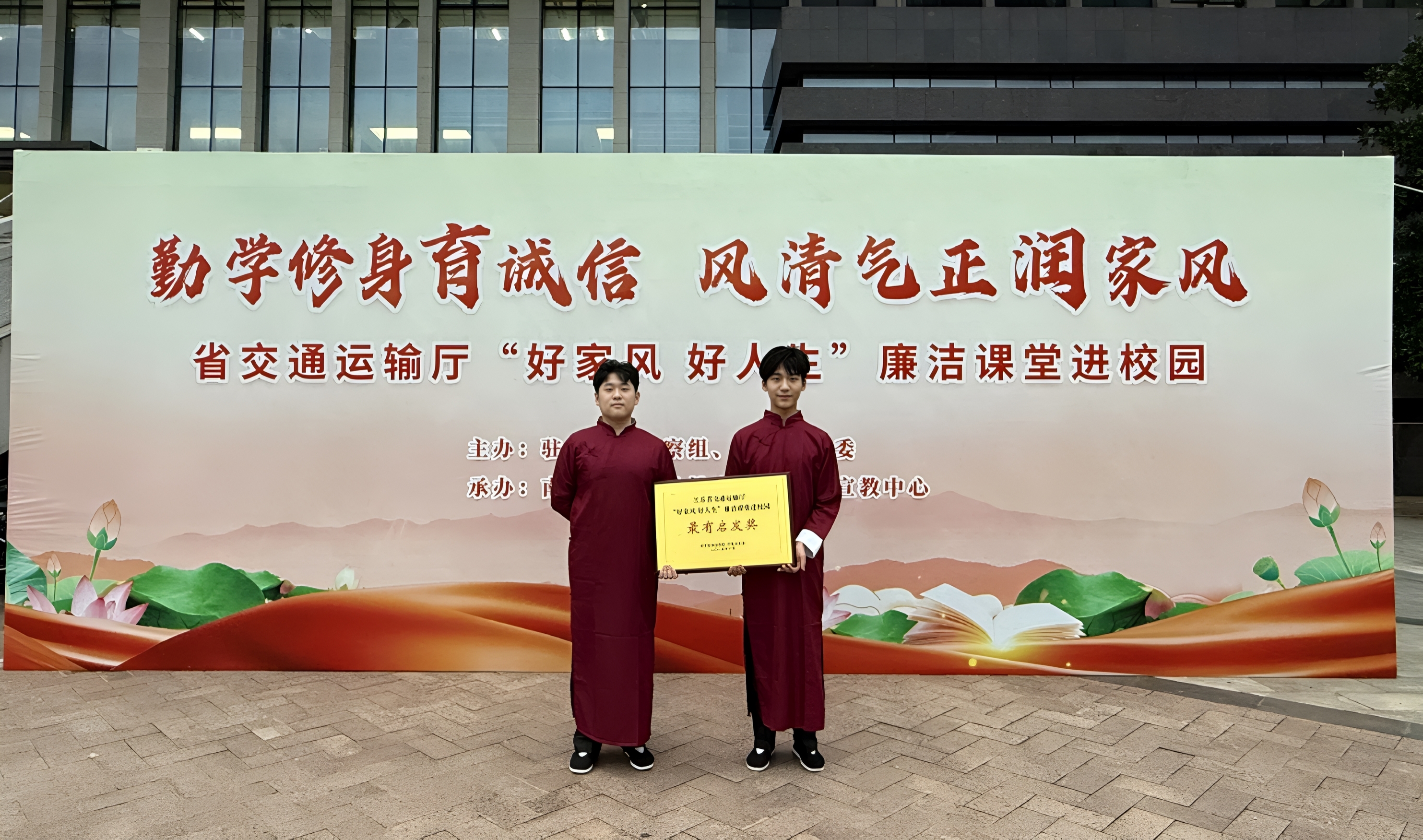 在廉洁课堂上,张伊,杨阳等老师指导编排、机电工程学院张子凡和吴熠杰表演的相声《文质彬彬》精彩亮相,节目以“改进文风”为主题,通过幽默诙谐的语言,生动展现“文风会海”的过往窘境,传递八项规定实施后“守正创新兴文风”的新风尚,引发现场观众强烈共鸣。表演过程中,默契配合,现场掌声不断,最终凭借鲜明的主题、精湛的演绎荣获“最有启发奖”,充分展现了我校学生的良好精神风貌与廉洁文化建设成果。