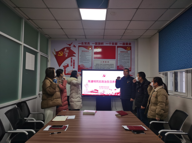 会上,首先由杨凤琴同志、曹维忠同志为陈建明同志颁发“生日”礼物--党员政治生日贺卡和红色书籍。在杨风琴书记的带领下,支部全体党员宣读入党誓词,重温入党初心,牢记党员使命。