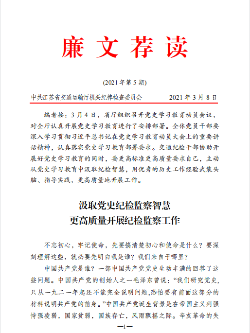 廉文荐读2021年第5期——汲取党史纪检监察智慧更高质量开展纪检监察工作
