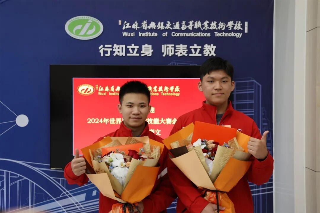 10月30日下午,学校举行欢迎仪式。在大赛领队、学校党委副书记朱雨兰老师的带队下,我校获奖选手陈玺和浦豪文携荣誉凯旋而来。学校党委委员、副校长耿兴华向获奖选手表示祝贺:“祝贺你们取得可喜的成绩,也感谢你们的努力拼搏,为江苏争光、为学校争光!”参赛选手陈玺和浦豪文则表示:“取得满意的成绩,要感谢学校的培养,感谢大赛主办方提供的竞技平台,感谢指导老师的辛勤关怀,希望在今后学习生活中也将不断提升自身技能,努力为学校争光。”获得“优秀指导教师”称号的李俊、沈加仁老师表示,“感谢学校提供的这样一个成长锻炼的平台,通过这次大赛为今后指导学生比赛工作积累不少经验,也为后续工作打下扎实的基础。”周围不断响起热烈的掌声。