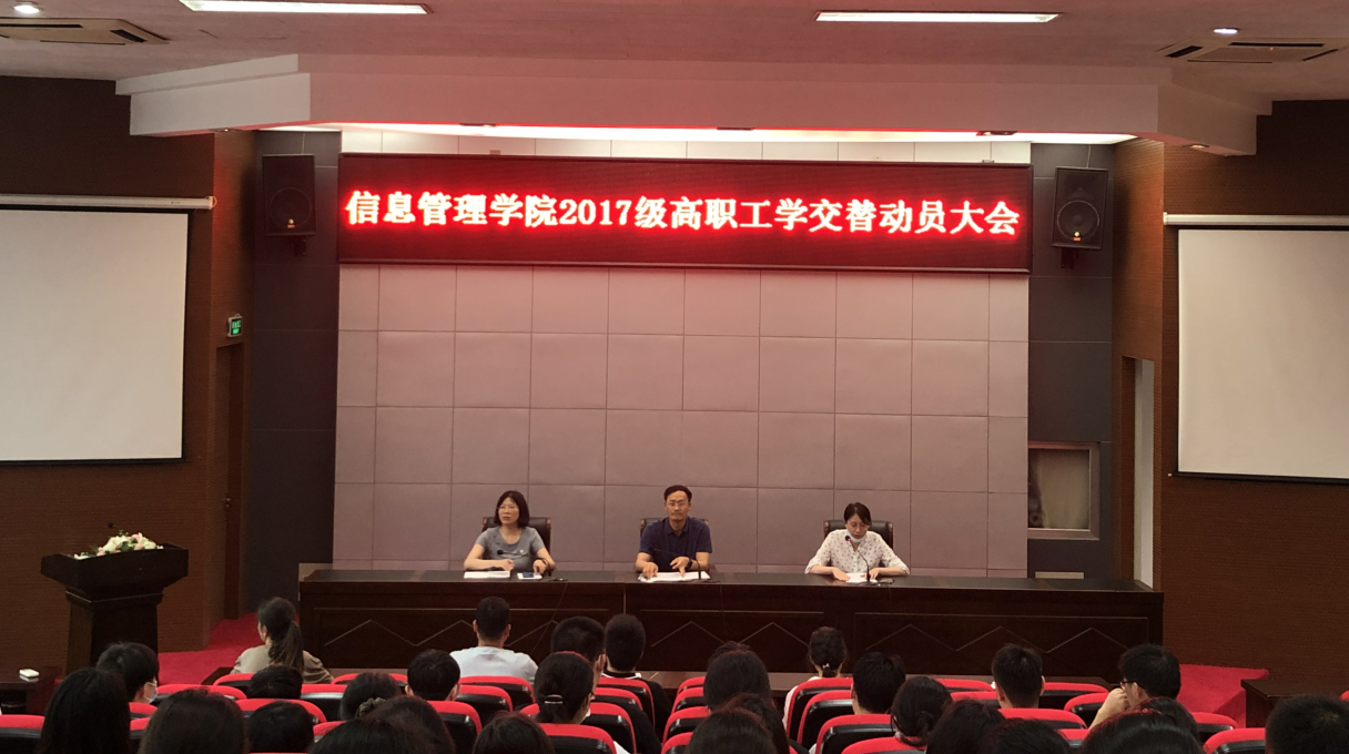 信息管理学院于20216月10日中午12:30在学校学术报告厅召开2017级高职工学交替动员大会。学院院长郑智飞、副院长蒋红梅、2017级全体高职生和辅导员以及综合办、学工办、各教研室主任老师们参加了动员会。